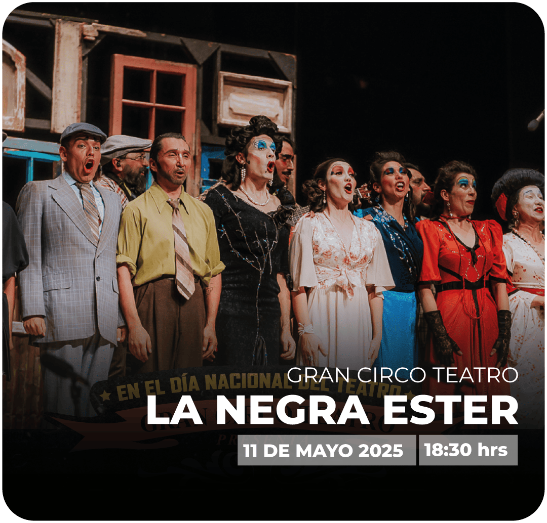 DESCRIPCIÓN DEL EVENTO: La Negra Ester, el clásico del teatro chileno, llega al Teatro Municipal de Chillán para celebrar el Día Nacional del Teatro. La creación teatral de Andrés Pérez Araya, basada en «Las Décimas de la Negra Ester» de Roberto Parra Sandoval, es protagonizada por Micaela Sandoval Ramírez y Tito Cancino Contreras. La responsable artística es Rosa Ramírez Ríos, y la música en vivo estará a cargo de la «Regia Orquesta». Esta obra es realizada por la Compañía Gran Circo Teatro.