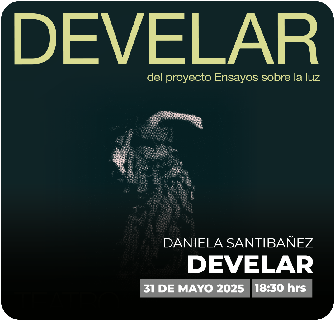DESCRIPCIÓN DEL EVENTO: Develar es un solo de danza contemporánea dirigido e interpretado por Daniella Santibáñez que se pregunta por la fotosensibilidad corporal, es decir, la relación sensible que existe entre el cuerpo, la luz y sus sombras. La obra, que se compone como un ritual de metamorfosis, va velando y develando imaginarios de cuerpos a través de una coreografía que mueve la pregunta por la luz.La obra fue creada junto a un equipo interdisciplinar a partir del diálogo y el intercambio entre la danza, la fotografía análoga y la creación de dispositivos de vestuario que modifican la arquitectura corporal y su movimiento. A su vez la dramaturgia coreográfica se desarrolló a partir del estudio de autores que abordan la luz en relación a la imagen, la espiritualidad y lo viviente.