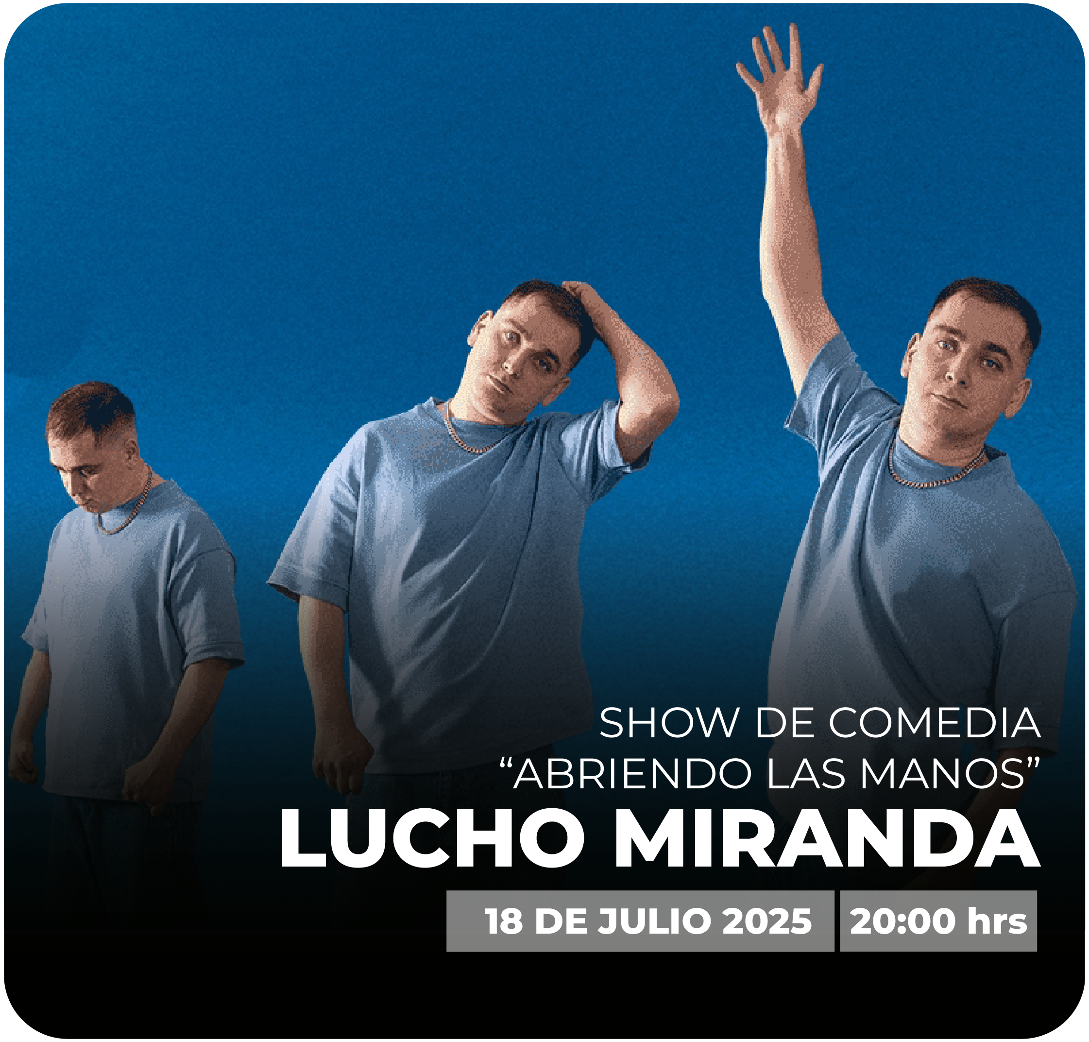 El gran comediante chileno, Lucho Miranda, llega por primera vez a la Gran Sala para interpretar un show inolvidable: «Abriendo las manos».