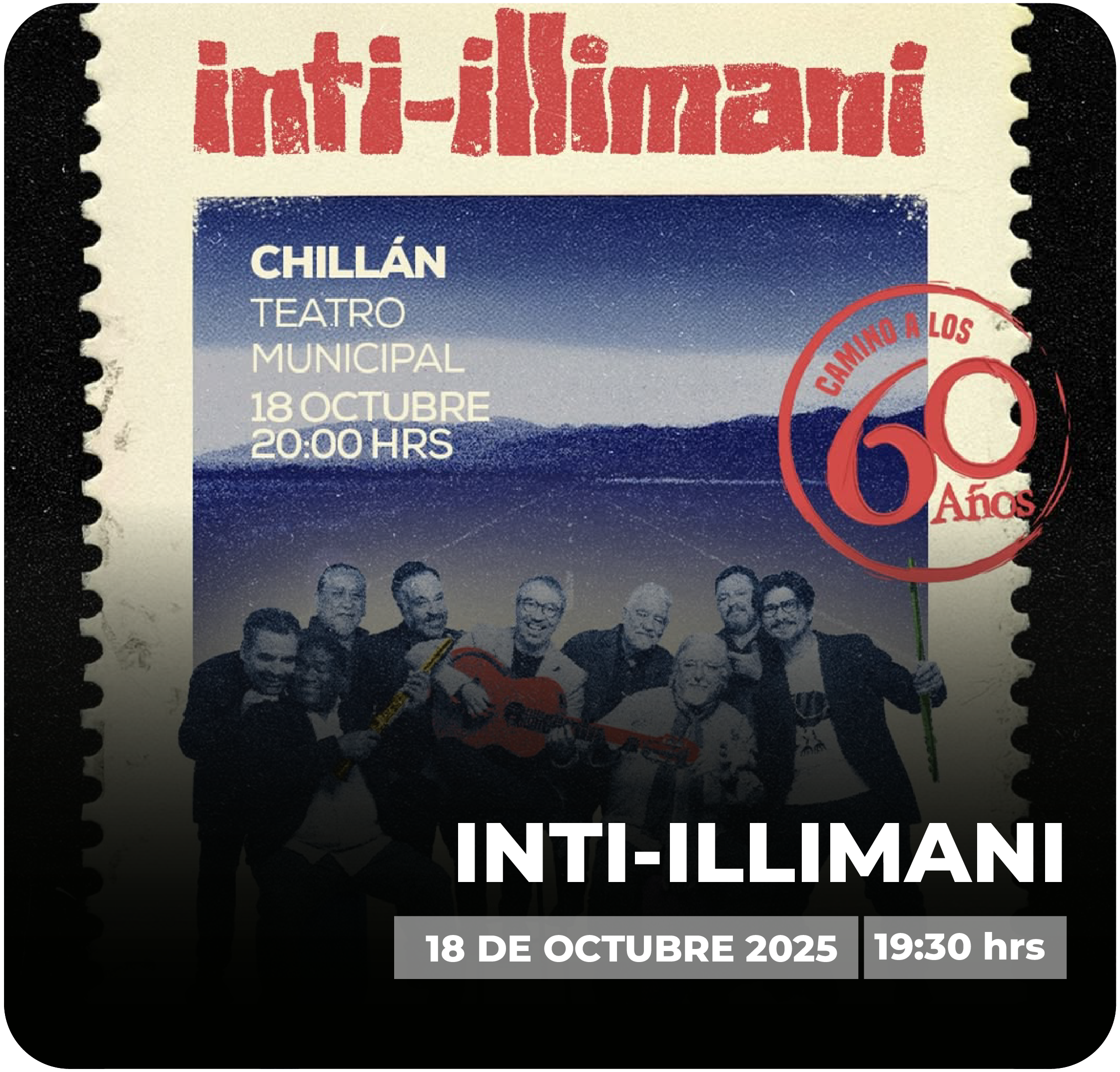 INITI-ILLIMANI LÍNEA TEMÁTICA: MúsicaFECHA Y HORARIO DE FUNCIÓN: 18 de octubre a las 20.00 horasLUGAR: Gran SalaTODO PÚBLICOENTRADAS A TRAVÉS DE TICKETPRO: https://www.ticketpro.cl/evento/3755/lucho-miranda-abriendo-las-manos–chillanDESCRIPCIÓN DEL EVENTO: Chillán, nos vemos pronto! 🎶El 18 de octubre este destacado grupo nacional llega a nuestros espacios con canciones, historias y el corazón abierto.¡Una noche inolvidable nos espera junto a ustedes! Equipo Comunicaciones Equipo Teatro Municipal de Chillán